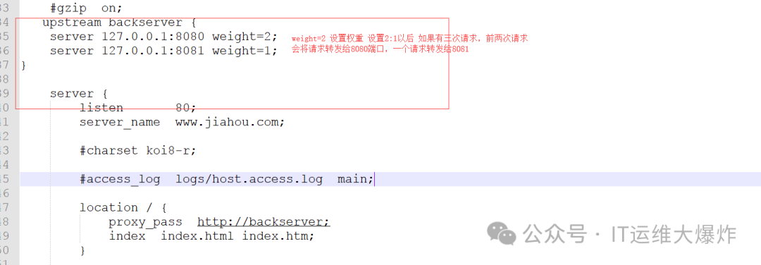 传统模式:nginx的配置中,可以提供类似如下的配置片段实现按照权重的转发