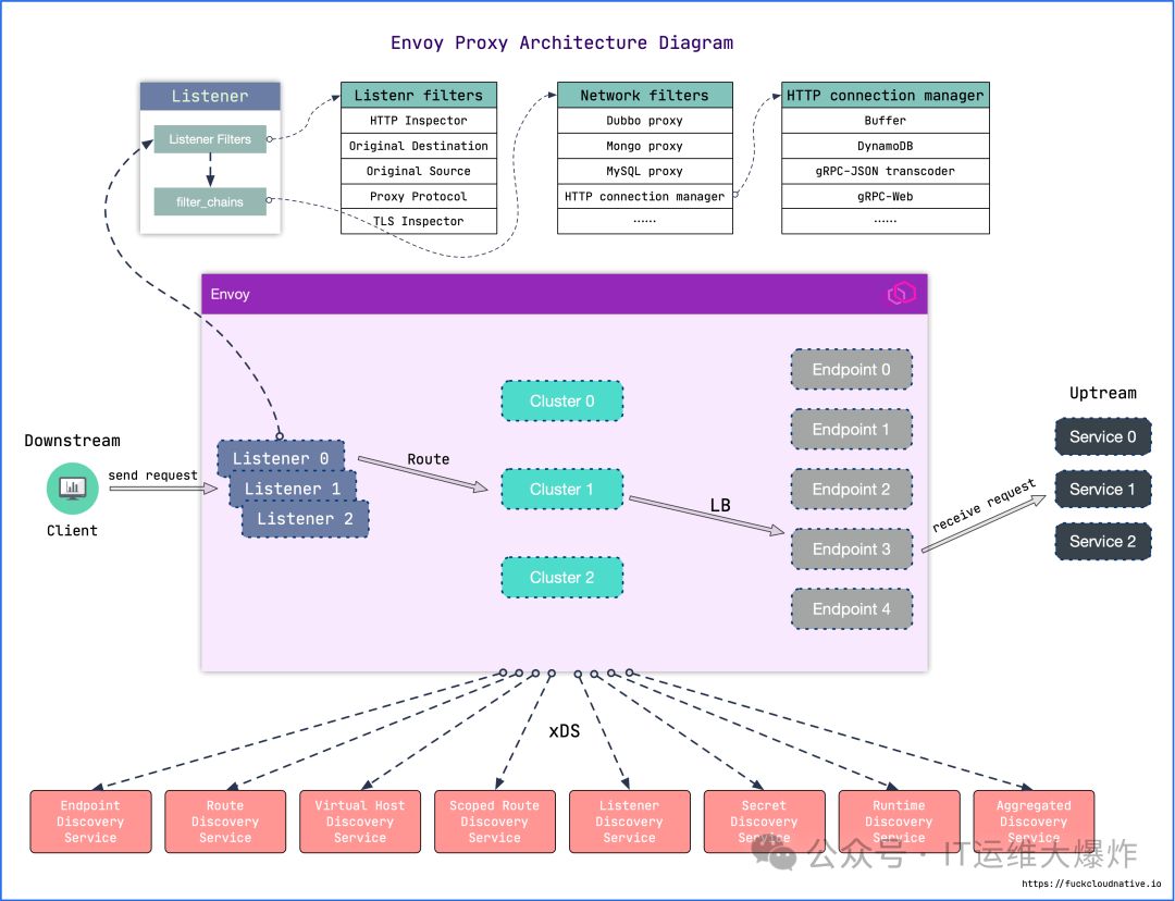 xDS 服务器:提供动态配置的源,包含 LDS、RDS、CDS 和 EDS 服务。