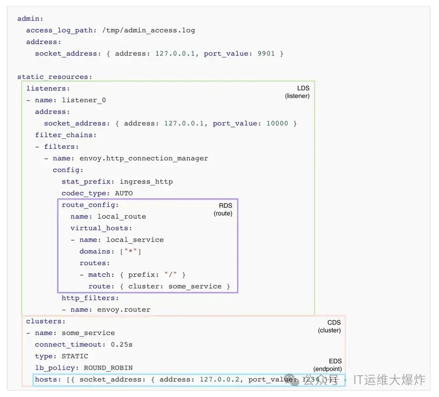 <!--其中每一个环节可以静态配置,也可以动态服务发现,也就是所谓的 `xDS`,这里的 `x` 是一个代词,是 `lds`、`rds`、`cds`、`eds`、`sds` 的总称,即服务发现,后 2 个字母 `ds` 就是 `discovery service`。-->