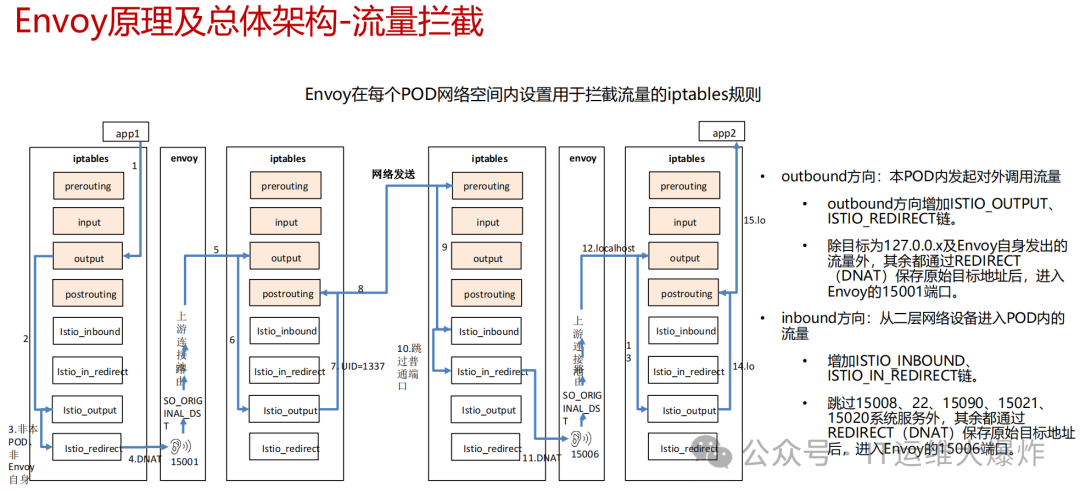 istio-init容器添加用于配置容器网络内iptables规则 • istio-proxy容器启动pilot-agent进程,使用UID=1337 GID=1337创建Envoy启动命令行与配置文件 。