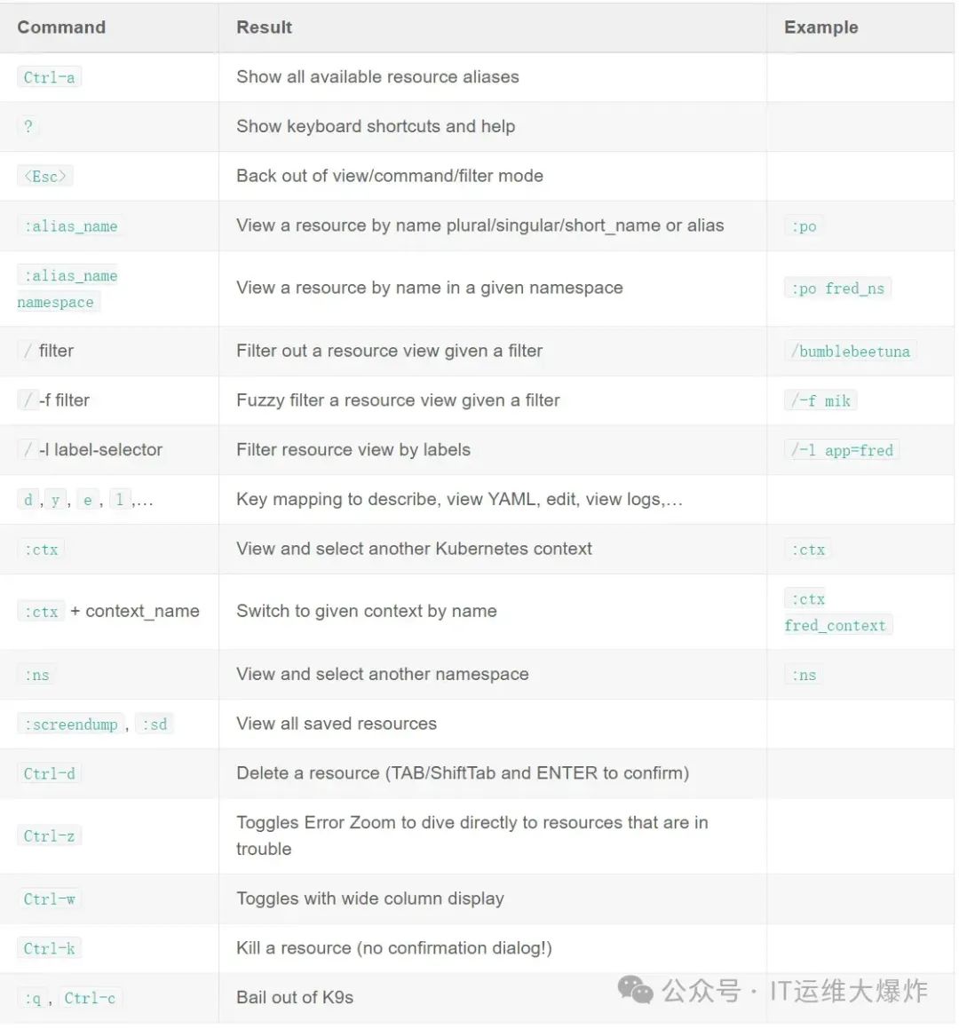 K9s使用别名来定位到大多数K8s资源,这里贴出K9S官方的按键绑定