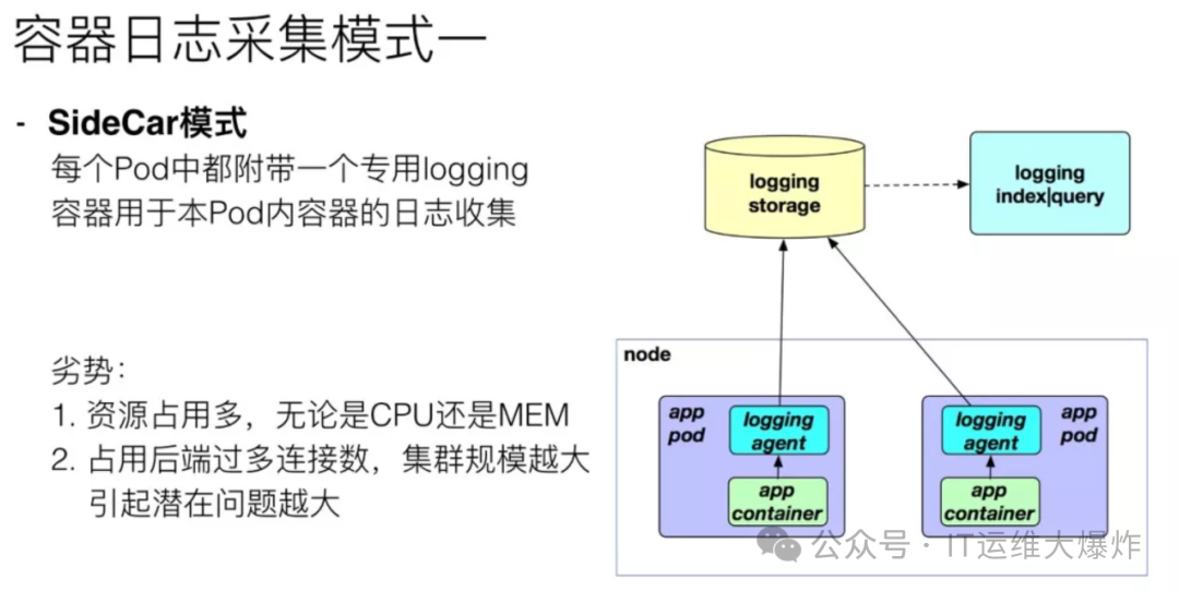 这种模式就是在 Pod 中除了运行我们的应用程序容器, 再起一个负责日志采集的容器,比如再起一个 logstash 或 fluentd 容器。当 Pod 数量一多,这种方案资源消耗很大,对日志存储后端也会占用过多的连接数,并且日志不输出到标准输出,不能通过 kubectl logs 命令查看。
