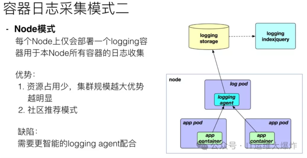 就是在每个 Node 上部署一个日志采集代理程序(如 filebeat,fluentd,或 logstash 等),一般是以 DaemonSet 的形式在每个 Node 上部署一个 Pod,来采集这个 Node 上所有容器的日志。这种模式的优点是资源消耗少,一个节点一个 Pod, 且对应用无侵入。