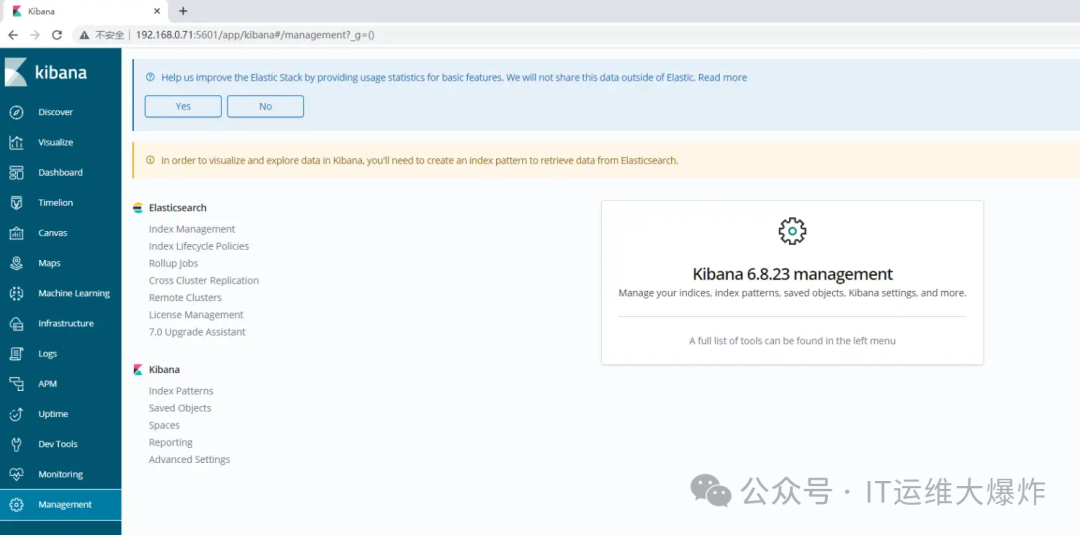 [root@10-60-249-255 ~]# docker run --name kibana -e ELASTICSEARCH_URL=http://192.168.0.71:9200 -p 5601:5601 -d kibana:6.8.23