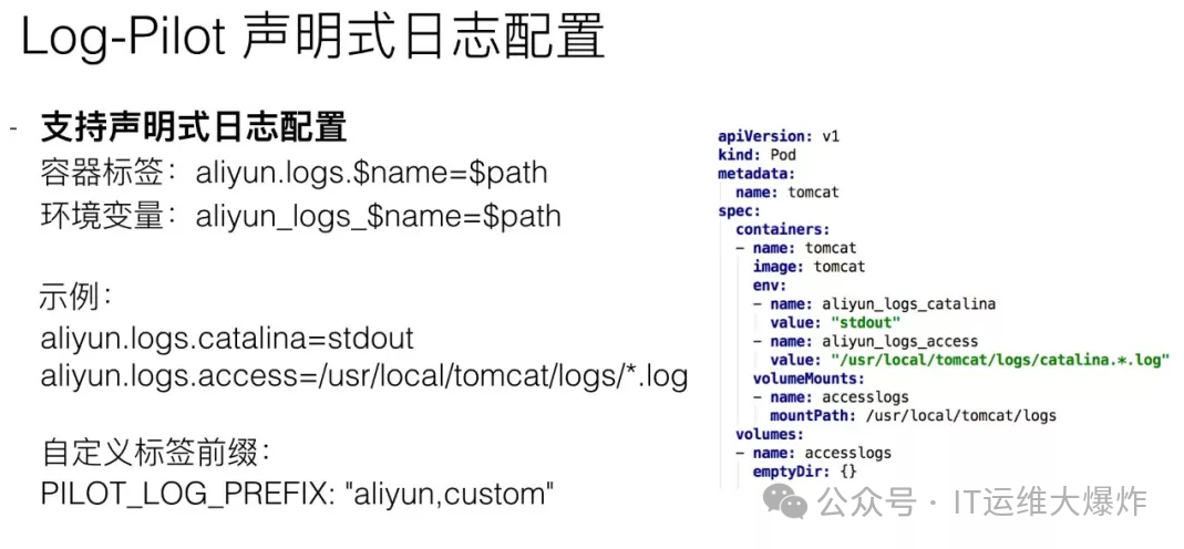 声明式配置。当您的容器有日志要收集,只要通过 label 声明要收集的日志文件的路径,无需改动其他任何配置,log-pilot 就会自动收集新容器的日志。