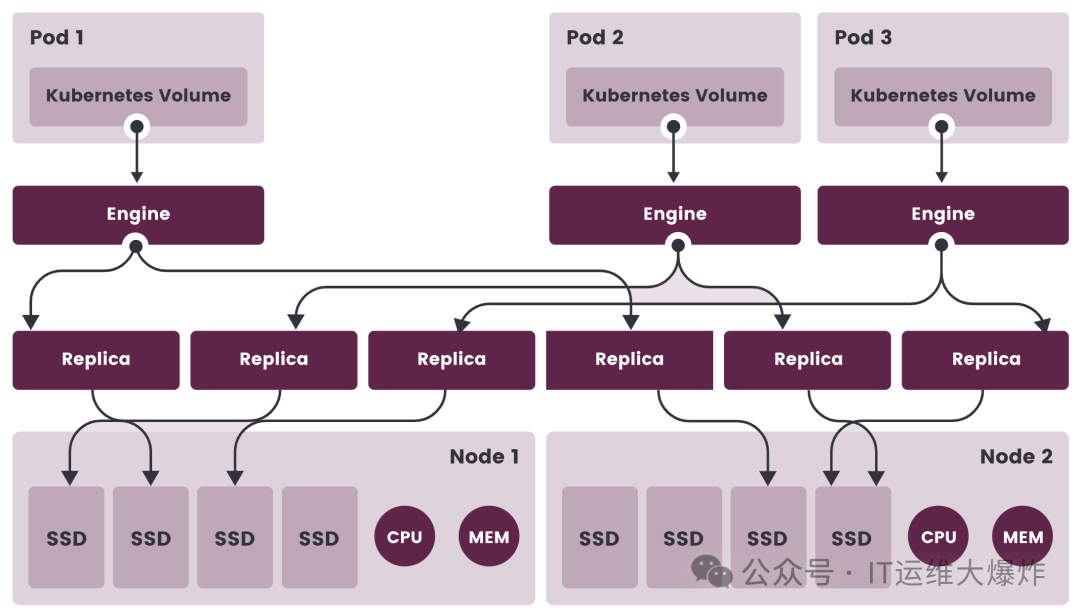 Longhorn Engine 始终与使用 Longhorn 卷的 Pod 在同一节点中运行,它在存储在多个节点上的多个副本之间同步复制卷。
