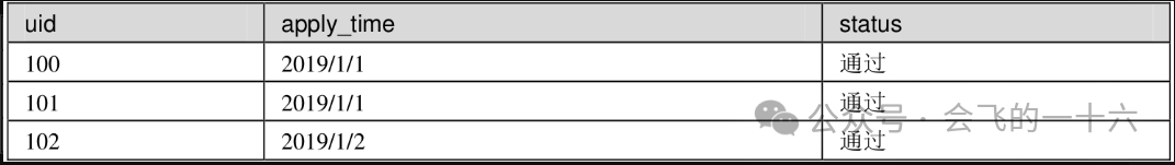 如上所示,在2019年1月1日的时候,只有uid=100和uid=101两个用户,所以这一天的快照表就只存储了这两个用户;截至2019年1月2日,已经有uid=100、uid=101、uid=102三个用户了,所以一天的快照表存储了这三个用户,且这一天uid=100的用户的状态是通过。