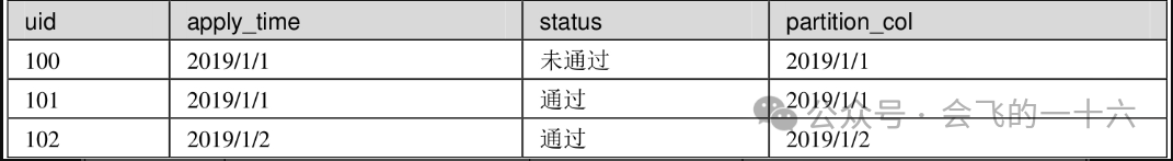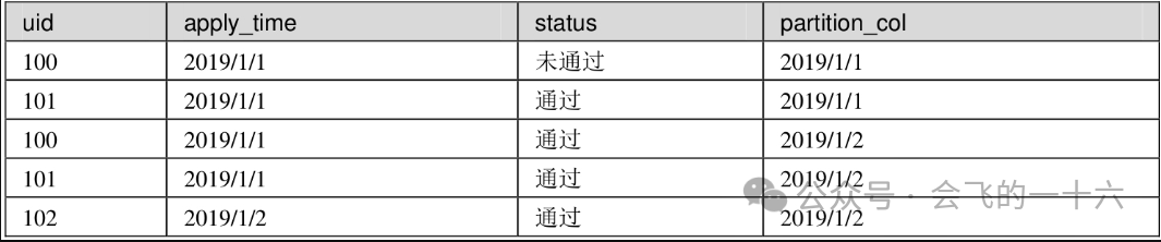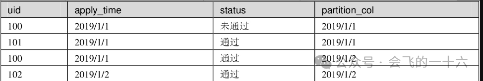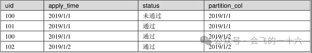 如上所示,uid=102的用户是2019年1月2日新增加进来的,所以存储在2019年1月2日的分区中,而uid=100的用户是2019年1月1日进来的,所以存储在2019年1月1日的分区中,且历史分区中的数据是不发生改变的,所以状态依然是未通过。