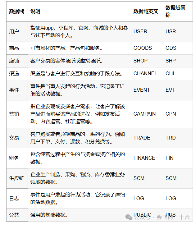 数据域需要抽象提炼,长期维护及更新,但不要轻易变动,在划分数据域时,既能涵盖当前所有的业务需求,又能在新业务接入时无影响的包含进已有的数据域中或者扩展出新的数据域,这是划分的一个准则。