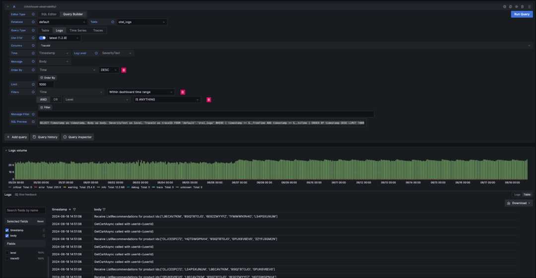 SELECT Timestamp as timestamp, Body as body, SeverityText as level, TraceId as traceID FROM "default"."otel_logs" WHERE ( timestamp >= $__fromTime AND timestamp <= $__toTime ) ORDER BY timestamp DESC LIMIT 1000