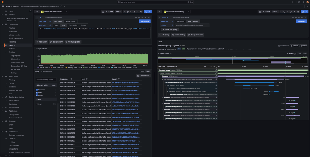 Open Telemetry 项目提供了一个演示应用【https://opentelemetry.io/docs/demo/】。这个应用的一个维护版本已经集成了 ClickHouse,作为日志和追踪数据的存储源。你可以在此找到相关的代码仓库【https://github.com/ClickHouse/opentelemetry-demo】。用户可以按照官方提供的部署指南【https://opentelemetry.io/docs/demo/docker-deployment/】,使用 Docker 来部署该演示应用。在部署过程中,除了已有的组件外【https://opentelemetry.io/docs/demo/collector-data-flow-dashboard/】,还将部署一个 ClickHouse 实例,用于存储日志和追踪数据。