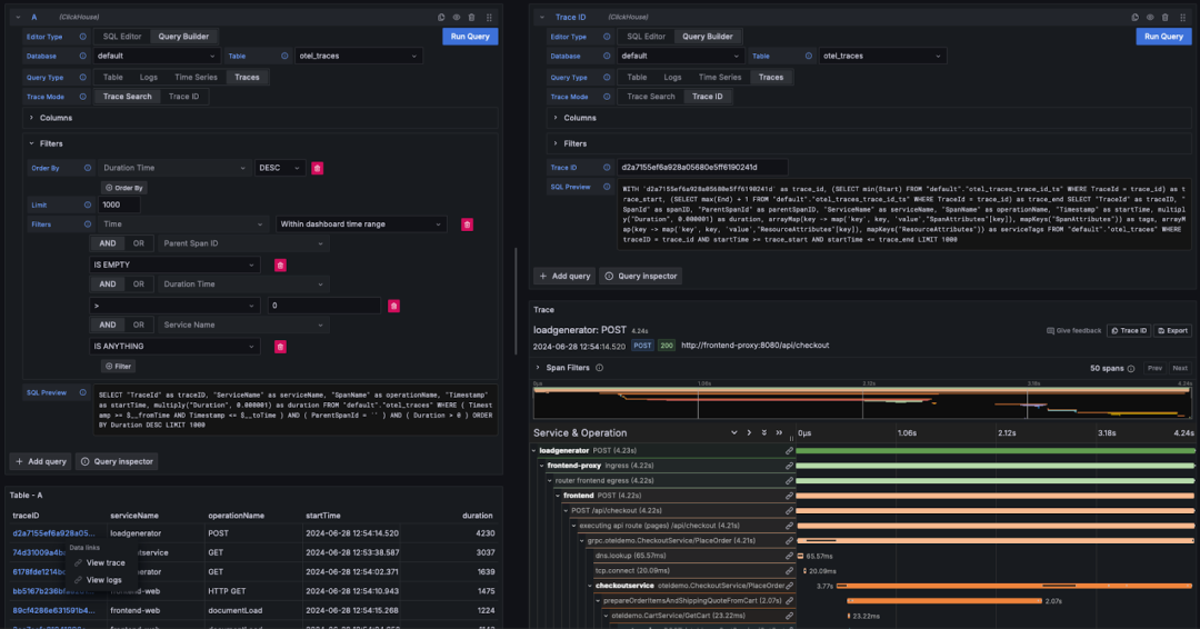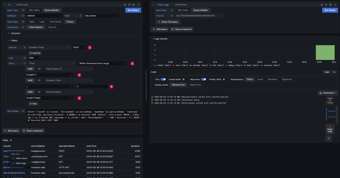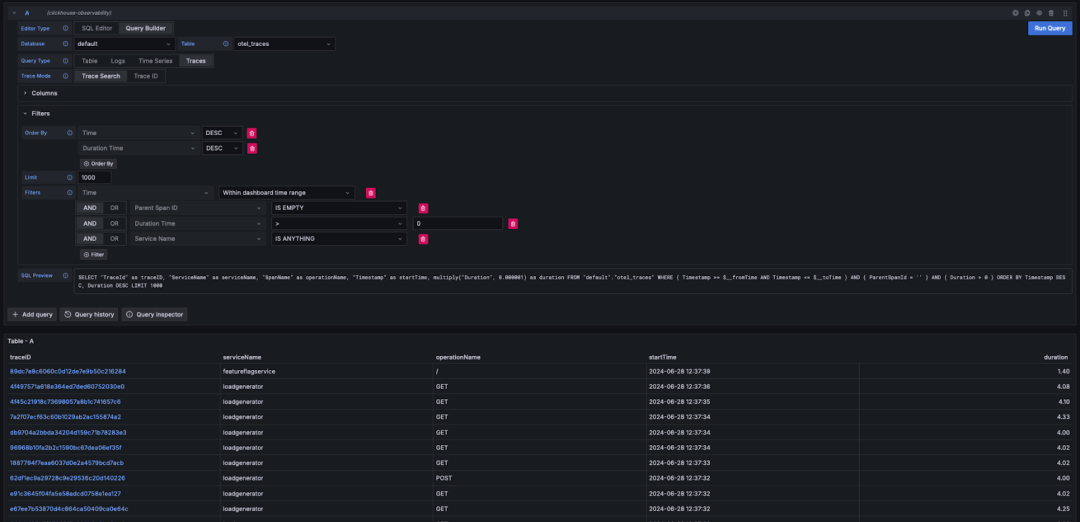 SELECT "TraceId" as traceID,"ServiceName" as serviceName,"SpanName" as operationName,"Timestamp" as startTime,multiply("Duration", 0.000001) as durationFROM "default"."otel_traces"WHERE ( Timestamp >= $__fromTime AND Timestamp <= $__toTime )AND ( ParentSpanId = '' )AND ( Duration > 0 )ORDER BY Timestamp DESC, Duration DESC LIMIT 1000