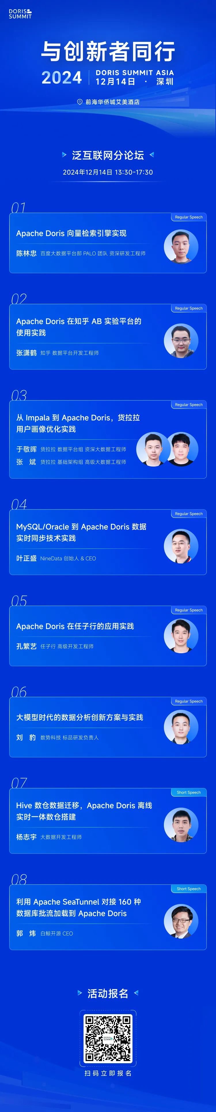 2024年12月14日,Doris Summit Asia 2024 将在「深圳·前海华侨城艾美酒店」正式举行。本次峰会由飞轮科技主办,阿里云、腾讯云联合主办,共同打造 Apache Doris 社区规模最大、规格最高、覆盖最广的大数据及数据库领域的年度技术盛会。本次论坛,NineData 创始人&CEO 叶正盛受邀参会,将带来主题为《MySQL/Oracle到Doris数据实时同步技术实践》的技术分享。