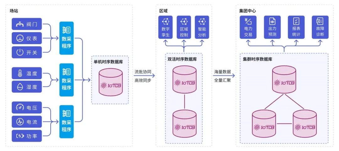 面向电力单场站数据管理场景,基于 IoTDB 构建的解决方案可以支持在电力场站生产过程中,将阀门、仪表、开关等关键设备记录的温度、湿度、电压、电流、功率等数据,通过用户自定义数采程序存储进 IoTDB。在保障高吞吐写入、低成本存储的基础上,IoTDB 更支持采用双活版部署,多副本管理进一步保证系统高可用,多重保障数据安全。