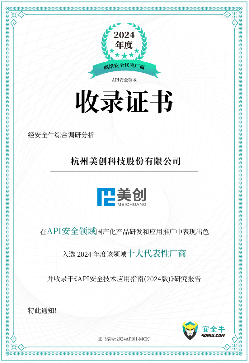 在行业实践中,美创API安全监测与访问控制系统的建设成效、创新点和推广示范价值也不断获得权威机构的认可。获中国信通院&数据安全共同体计划-2023年数据安全“星熠”案例奖、中国信通院-2023API治理应用优秀案例、2024数商典型应用场景“乘数榜”。