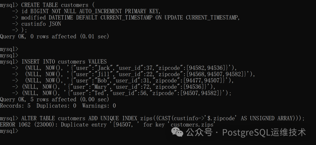 多值索引可以定义为唯一键,如果定义为唯一键,则尝试插入已经存在于多值索引中的值将返回重复键错误。如果重复的值已经存在,尝试添加一个唯一的多值索引失败。