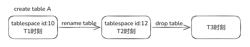 如图3所示,当系统恢复到T2时刻,表A的tablespace id就是12,而T3时刻及之后所识别到drop语句,会直接返回错误,因为当前的时间段及之后无该表存在。