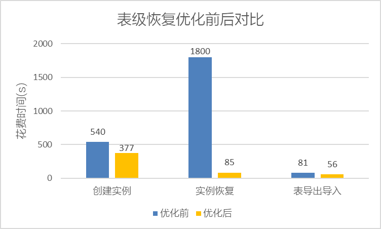 以某公有云上的某用户使用的2T实例恢复为例,对一张大小为12M的表进行测试,优化前后整体耗时对比,如图5所示: