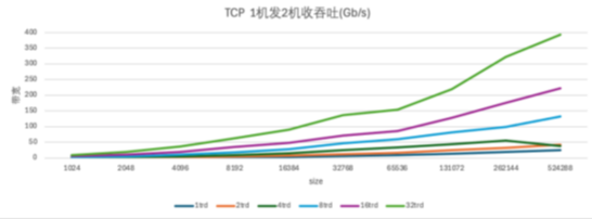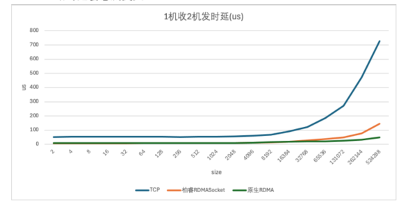 在时延方面,柏睿RDMA Socket的表现尤为出色。测试数据显示,在发送包大小不超过RDMA的4096 MTU时,柏睿RDMA Socket与原生RDMA的时延基本持平,且整体比TCP以太网时延快7倍左右。即使在发送包大小超过RDMA 的 4096 MTU时,柏睿RDMA Socket的时延也仅略有增加,但整体仍然比TCP以太网快5倍左右。