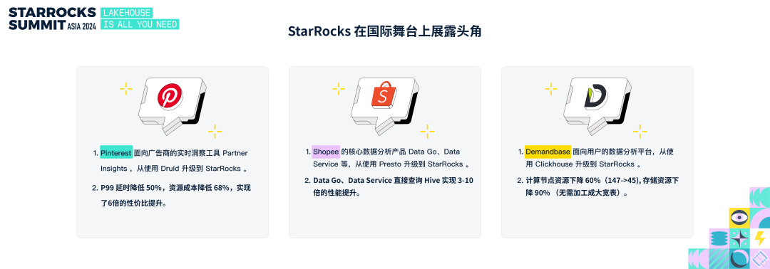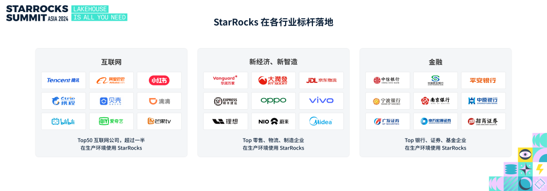 StarRocks TSC Member,镜舟科技 CTO 张友东以“Lakehouse Is All You Need”为题做了开场演讲,深入解读 Lakehouse 的演进趋势以及 StarRocks 在 Lakehouse 方向的技术深耕与创新。StarRocks 自 2021 年 9 月开源以来,社区持续保持高速发展。GitHub Star 数已超过 9300,超过 400 名开发者参与社区贡献,对齐到三年时间里,StarRocks 是同类开源项目里增长最快的。随着数据分析对企业经营的重要性日益增加,StarRocks 的应用已经在多个行业落地。在互联网领域,包括腾讯、阿里巴巴、小红书、携程、贝壳、滴滴在内的多家知名企业已将 StarRocks 投入生产环境。排名前 50 的互联网公司中,超过一半正在使用 StarRocks。互联网企业的数据技术选择是业界的风向标,这些头部企业的采用进一步证明了 StarRocks 代表着先进的生产力。在新经济和新制造行业,StarRocks 也发挥了显著作用。例如,领先的零售企业(华润万家、大润发)、物流企业(京东物流、顺丰)、手机制造厂商(OPPO、VIVO)以及新势力车厂(理想、蔚来)等,在生产中使用 StarRocks。这些企业利用 StarRocks 提升经营效率。金融行业同样是 StarRocks 的重要应用场景。多家顶级股份制银行(中信、民生、平安银行)、城商行(宁波银行、南京银行、中原银行)以及证券基金公司(广发证券、申万宏源、招商证券)均已在生产环境使用 StarRocks。这些企业利用 StarRocks 降低金融风险、优化投资决策。不仅在国内,StarRocks 的影响力也在国际舞台上逐步显现。在过去的一年里,多个海外企业通过引入 StarRocks 取得了显著的技术和业务效益:StarRocks 的应用案例远不止于此。在国际市场,还有许多知名企业在使用 StarRocks,包括零售领域的巨头沃尔玛和屈臣氏、在线旅游领域巨头的 Airbnb、Expedia,以及游戏领领头羊 EAgames、加密货币领域领头羊 Coinbase 等。One more thing,全球市值超万亿美元的企业中已有两家正在使用 StarRocks,充分展示了其在全球范围内的竞争力和影响力。