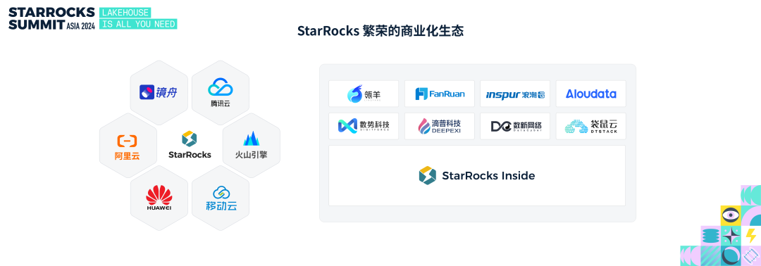 随着 StarRocks 社区用户越来越多,产生的商业化诉求也越来越多,目前有部分厂商提供 StarRocks 的商业化支持。例如,镜舟科技基于 StarRocks 开发了企业级的镜舟数据库,现已在多个行业成功落地。国内领先的云厂商(如阿里云、腾讯云、火山引擎、华为云和移动云)也在各自的平台上推出了 StarRocks 的托管服务。此外,许多数据平台和数据中台厂商将 StarRocks 作为数据底座,推动其产品性能提升。例如,瓴羊在其产品中采用StarRocks 作为轻量化数据底座,帆软 BI 利用 StarRocks 加速 BI 分析,而数势、滴普等企业则通过 StarRocks 支撑用户画像、指标平台等产品的数据分析。正如 Nvidia Inside 是 AI 时代的核心计算动力,StarRocks Inside 给 BI 数据分析系统提供强大的计算动力。未来,StarRocks 将继续推动生态建设,欢迎更多厂商及数据平台产品使用 StarRocks 驱动业务增长。StarRocks 的发展离不开众多厂商和用户的广泛参与和深度支持。这些厂商和用户在使用 StarRocks 的同时,积极参与了社区建设,为其持续发展注入了动力。作为 StarRocks 社区的主导力量,镜舟科技贡献了 70%+ 的核心功能,包括 CBO 优化器、向量化技术、主键模型等关键特性。云厂商也在 StarRocks 的生态中扮演了重要角色。例如,阿里云、腾讯云和火山引擎深度参与了数据湖分析、物化视图和行列混存等多个功能的开发。与此同时,StarRocks 的用户也通过自身的使用反馈推动了产品的不断完善。例如,腾讯、华为、滴滴、得物和芒果TV等企业贡献了文本检索、向量检索和全局字典、K8S Operator 等创新功能。在过去三年,StarRocks 经历了 3 个大版本的迭代,始终保持快速迭代和技术创新,分别是 1.0、2.0 以及现在正在迭代的3.0大版本。