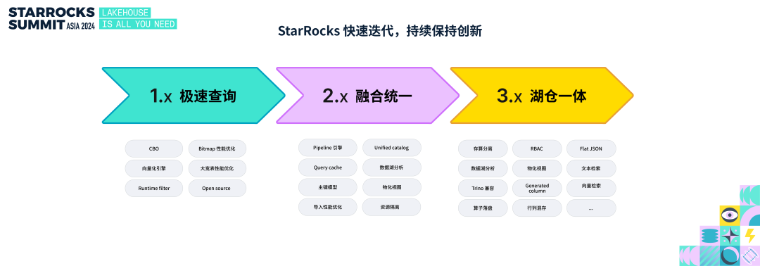 1.0 以极速性能为主线,凭借极致的查询性能,在业界企业里开始落地使用。2.0 以融合统一为主线,能支持更多的应用场景,在企业里不断扩大的使用规模,统一分析技术栈。3.0 以湖仓一体为主线,希望推动数据分析技术栈向 Lakehouse 方向演进, 推出存算分离架构,物化视图、湖仓分析、半结构化数据分析等一系列的重要特性。