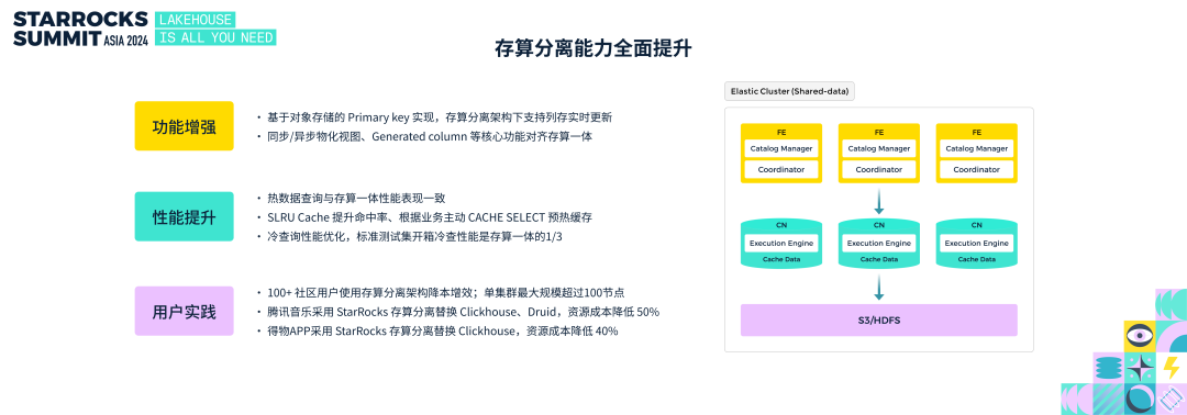 去年 4 月份,StarRocks 3.0 版本正式发布存算分离架构,经过一年半的打磨,存算分离在性能、功能等方面得到全面的提升。在功能方面,实现了基于对象存储的主键索引,基于存算分离架构也能高效支持实时分析。同时其他的关键功能,例如同步/异步物化视图,generated column、query cache 等,也对齐了存算一体。在性能方面,热数据查询性能与存算一体一致;引入 SLRU 算法进一步优化 Cache 命中率,避免大查询影响;同时增加 cache warmup 能力,用户可以主动的根据业务需求预热缓存;最后就是不断优化冷查,在标准测试下,完全冷查的开箱性能达到存算一体的1/3。在用户方面,目前社区已经有 100+ 用户在生产环境使用了 StarRocks 存算分离,单集群最大规模突破 100 节点。一句话总结,StarRocks 存算分离是企业降本增效神器,很靠谱,放心用。