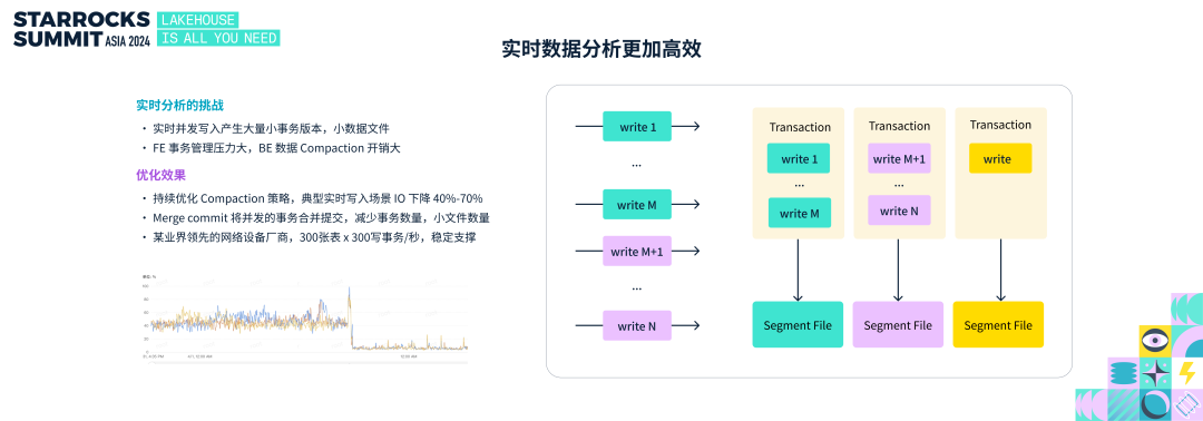 业务对数据分析的实效性要求越来越高,数据实时高并发的写入,产生很多小事务,小文件,给 StarRocks FE 元数据管理带来压力,BE 的数据 Compaciton 也会产生很大的开销。一方面,StarRocks 主键模型持续优化实时场景 Compacion 策略,在典型的实时写入场景下,I/O 量下降40%-70%。另一方面,针对实时高并发场景,StarRocks 支持了 merge commit 的策略,将并发执行的多个小事务,合并为大事务提交,从而减少事务数量,减少小文件。在某国际领先的网络设备厂商的场景中,面对 300 张表、每张表每秒 300 并发的写入场景,StarRocks 能稳定支撑。