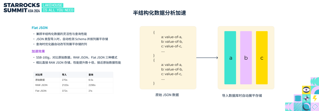 半结构化在数据分析场景越来越普遍,如何兼顾灵活性与查询性能是半结构化数据分析的重要挑战。StarRocks 3.1 版本里推出了生成列的能力来加速半结构化数据分析,通过将半结构化数据里的指定的列单独存储来提升查询性能,这种方法加速效果好,但用户需要手动指定生成哪些列,不够灵活,不够易用。于是 StarRocks 推出 Flat json 的能力,针对 JSON 数据列,可以在写入时自动按列展平存储;JSON 展平,相比于按原始数据导入性能有数倍提升,查询性能有数十倍的提升。
