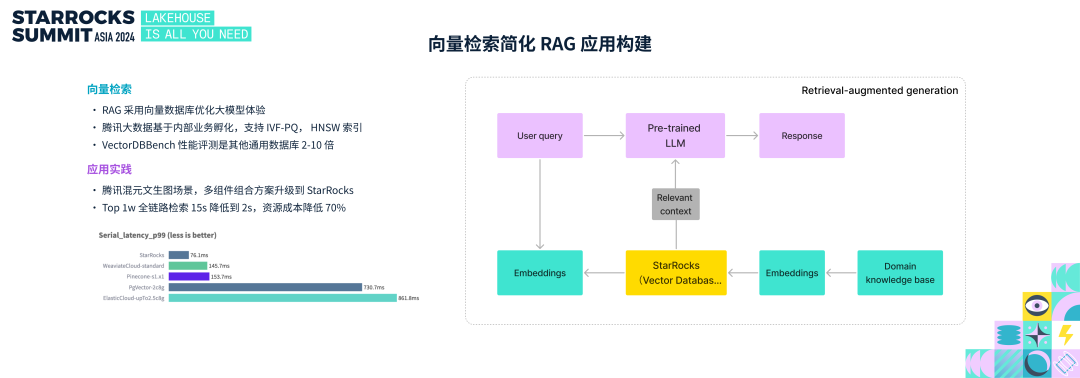 大模型的广泛应用带火了 RAG 应用,RAG 通过将领域知识库存储到向量数据库,用户查询时可以先从向量数据库获取到更多的上下文,然后再将上下文喂给大模型来增强体验。腾讯大数据团队在过去几年内部数据分析场景大规模应用 StarRocks,在今年他们在内部真实的业务场景里孵化出了 StarRocks 向量检索的能力。StarRocks 向量检索目前支持 ivf-pq、hnsw 两种索引算法,在 VectorDBBench 的性能评测中,相比其他具备向量检索功能的数据库有 2-10 倍的性能提升。结合腾讯大数据团队之前贡献的文本检索能力,StarRocks 可以支持标量、文本、向量的混合检索过滤,在混元大模型文生图的场景里,StarRocks 相比原有的多组件组合方案,全链路延时从 15 秒降低至 2 秒,资源成本降低 70%。