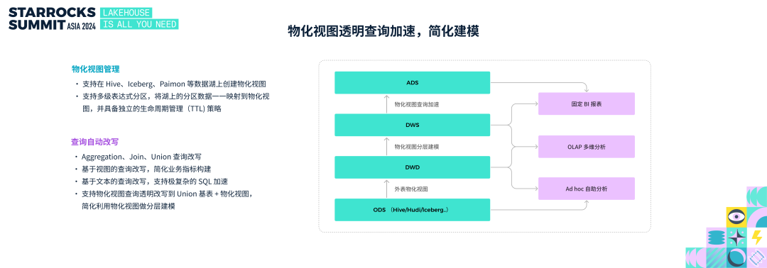 物化视图的加速原理很简单,在数据分析场景中却极具挑战性,主要是因为分析场景中的 SQL 多种多样,既可能由数据库专家编写,也可能由分析师编写,或者程序自动生成。在社区中,已有数百位用户通过物化视图实现了透明查询加速,面对丰富的加速场景,经过多个版本的持续优化,物化视图整体功能已非常完善。在过去一年里,物化视图的改进主要集中在视图维护与查询加速两方面。物化视图管理上,主要是增强了数据湖上物化视图的能力,支持在 Hive、Iceberg、Paimon 等数据湖上创建物化视图;并支持多级表达式分区,可将数据湖中的分区数据一一映射到物化视图,并提供独立的生命周期管理(TTL)策略。在自动查询改写上,从基于 Aggregation、Join、Union 的改写扩展到支持基于视图的改写和文本改写,使业务加速更加便捷。另外,StarRocks 还支持查询物化视图自动改写到查询基表,进一步简化基于物化视图的分层建模流程。