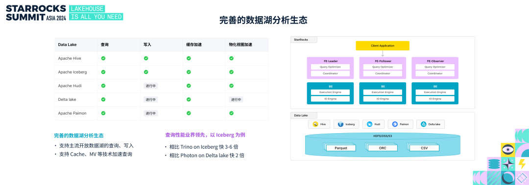 StarRocks 从 1.0 版本便开始支持湖分析的能力。从最初支持 Hive 数据湖,随后扩展到 Iceberg、Paimon 等更多开放数据湖。从支持数据湖分析、数据湖写入、数据湖缓存加速,以及在数据湖上创建物化 MV 等功能,如今,StarRocks 已实现了较为完善的数据湖分析能力。在性能方面,以查询 Iceberg 为例,StarRocks 查询 Iceberg 的速度是 Trino 的 3-6 倍,同时在查询 Delta Lake 时,其性能是 Databricks Photon 的 2 倍。
