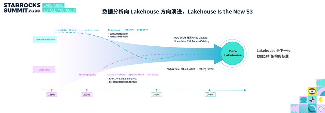 过去十多年里,分层架构得到了广泛应用。在不断发展的过程中,数据湖与数据仓库也在不断突破边界,加速了两者的融合。从数据仓库的演进来看,新兴的数据仓库(如 Snowflake、Redshift、BigQuery)普遍采用云原生的存算分离架构,并且支持直接查询开放数据湖的能力。与此同时,随着新兴数据湖格式(如 Iceberg、Hudi、Delta Lake)的发展,数据湖的事务支持能力显著提升,在性能方面,通过优化数据分布、引入缓存机制等技术,数据湖的分析性能也得到了大幅改善。2024 年,Lakehouse 的发展更是迎来了重要的里程碑:Databricks 收购 Tabular,并开源 Unity Catalog;Snowflake 开源 Polaris,争相抢占 Lakehouse 的入口。另外,就在三天前的 AWS reinvent 大会上,AWS 发布了 S3 Tablet Bucket,采用了 Iceberg 的开放格式。种种迹象表明,Lakehouse 的时代已经到来。