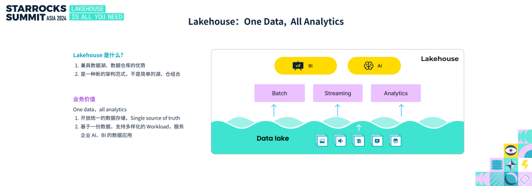 Lakehouse 的确拥有非常大价值,而 StarRocks 作为最适合 BI 数据分析的 Lakehouse 引擎,可以让数据湖中的数据高效地转化为价值。Lakehouse is all you need, StarRocks will power it!最后,特别感谢每一位用户和开发者,感谢你们为 StarRocks 社区的每一条问题反馈、每一个 PR,以及每一次布道活动。正是你们的努力,使得 StarRocks 不断成长和进步。我们也希望在社区的陪伴下,StarRocks 能为大家的公司带来业务增长,同时助力个人实现技术成长。让我们携手共进,共同见证 Lakehouse 的发展浪潮。🎉感谢各位小伙伴对 StarRocks Summit Asia 2024 的关注与支持!应广大参会者的需求,峰会演讲资料领取通道现已开放。扫码下方二维码即可领取!