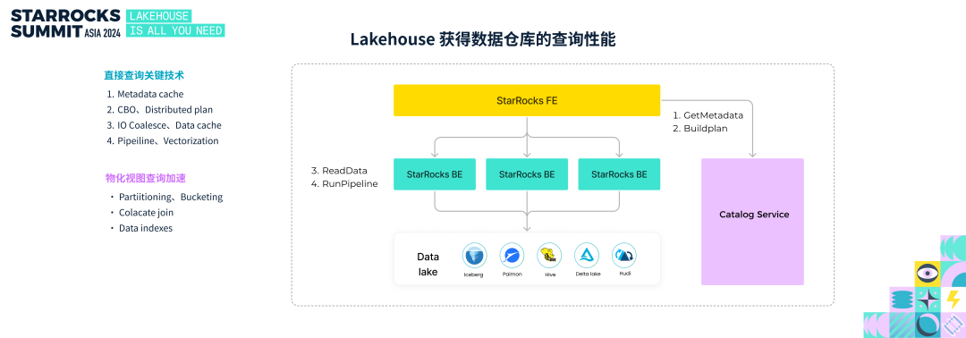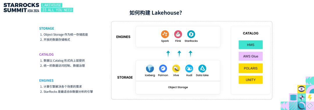 接下来我们聚焦到 StarRocks,探讨如何基于 StarRocks 构建 Lakehouse,只需三步:- 选择开放的数据湖作为底座,例如 Iceberg 、 Paimon;