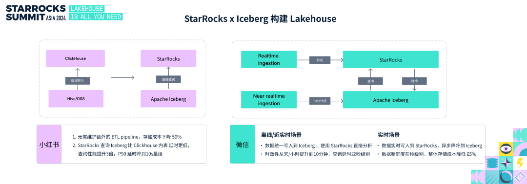 小红书的 REDBI 系统最初采用 ClickHouse,通过 ETL 将 Hive 和 OSS 的离线数据导入 ClickHouse 提供查询服务。今年,他们成功升级为 StarRocks + Iceberg 的 Lakehouse 方案。无需再维护复杂的 ETL 流程,存储成本下降50%,借助湖上数据 zorder 排序等技术,P90 的延时下降到 1/3,达到 10s 量级。微信基于 StarRocks 和 Iceberg 构建 Lakehouse 架构。在离线和准实时场景中,他们选择将数据写入 Iceberg 作为统一存储,通过 StarRocks 直接分析,实现了数据新鲜度从天/小时级别提升到 10 分钟级别,查询延时则优化到了亚秒级。在秒级实时场景中,由于 Iceberg 无法支持秒级实时写入,他们将数据写入 StarRocks 以实现实时分析,并异步降冷至 Iceberg 统一存储;既满足了秒级新鲜度的需求,整体存储成本降低 65%。StarRocks x Paimon 构建 Lakehouse