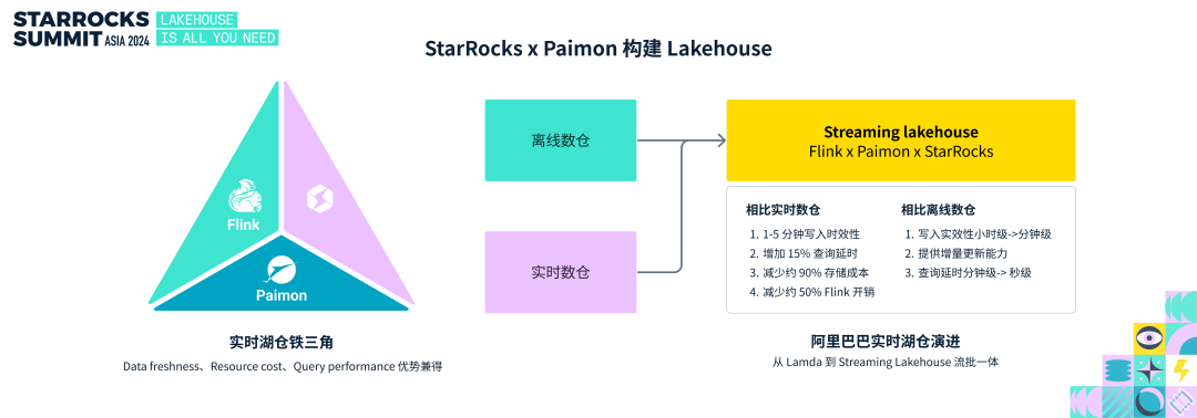 在上周结束的 Flink Forword 大会上,已经有很多企业实践了实时湖仓范式,包括阿里巴巴,喜马拉雅,同程旅行,vivo 等众多企业。阿里巴巴从传统的离线数仓 + 实时的 Lambda 架构,演进为 Flink + Paimon + StarRocks 的实时 Lakehouse 方案,在饿了么的业务中,已经充分体现了这个方案的价值: