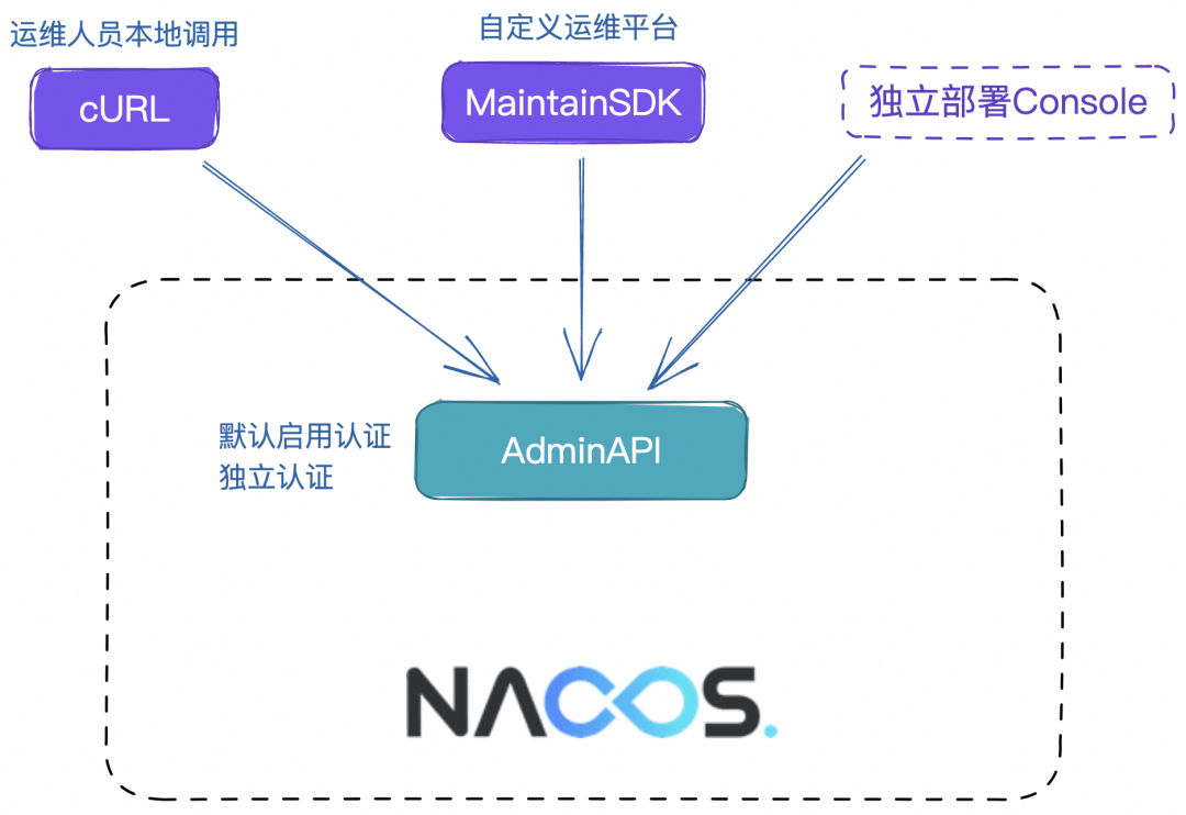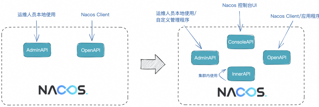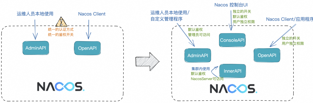 在 Nacos 3.0 之前,API 主要分为两大类:面向客户端和应用程序的 OpenAPI,以及供运维人员管理使用的 AdminAPI。这种分类方式在实际使用场景中存在一定的矛盾,比如用于引擎间数据同步的 API 和控制台上进行数据检索的 API,导致这部分 API 无法合理地对外开放和描述。同时,由于不同 API 对安全认证需求的差异,粗略将 API 分为两类也难以满足安全认证的多样化要求。为了解决这些问题,Nacos 3.0 对 API 进行了更精细化的分类,具体包括:提供给客户端和应用程序的 OpenAPI、供运维人员和管理平面使用的 AdminAPI、用于控制台 UI 的 ConsoleAPI,以及引擎节点之间的 InnerAPI。这种新分类方式不仅针对不同使用场景提供了多维度的数据访问 API,同时也为不同类型的 API 实施相应的安全认证机制奠定了基础。
