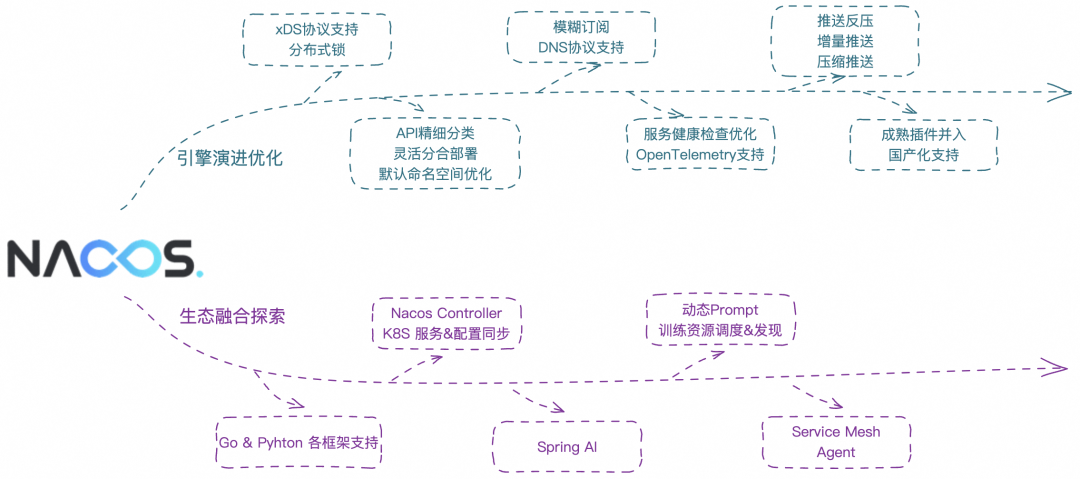 在引擎自身方面,新版本计划引入了服务与配置的模糊订阅功能,使用户能够更灵活地管理服务和配置,简化在网关应用中服务发现和配置订阅的操作流程。此外,我们计划支持 DNS 协议,以进一步拓展 Nacos 在支持较弱编程语言场景中的适用性。另外对于服务健康检查体系,我们将优化相关机制,通过将健康检查与服务类型解耦,提供更多关于服务可用性的判断依据,这将使微服务之间的流量调用更加灵活,同时确保系统的稳定运行。最后对于社区中已经比较成熟的插件,我们会将其纳入 Nacos 的主干仓库中进行维护,诸如 PostgreSQL 插件、AES 配置加密插件等,让这些插件在后续版本中随引擎一起发布、不需要再独立构建引入。在生态建设方面,我们将通过 Nacos Controller 的快速迭代,实现 Kubernetes 服务与配置的同步管理,从而使云原生环境下的使用变得更加便捷。此外,我们将积极探索多语言生态与 AI 大模型的集成,通过支持多语言应用框架以及 Spring AI 和其他 AI 大模型开发框架的动态 prompt 发现和资源发现,为用户提供更加丰富的功能选择与应用场景,努力构建一个高效、灵活的分布式协调平台。