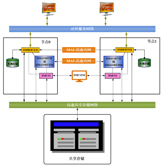 下图为一个部署了 DMASM 的 DMDSC 集群结构图: