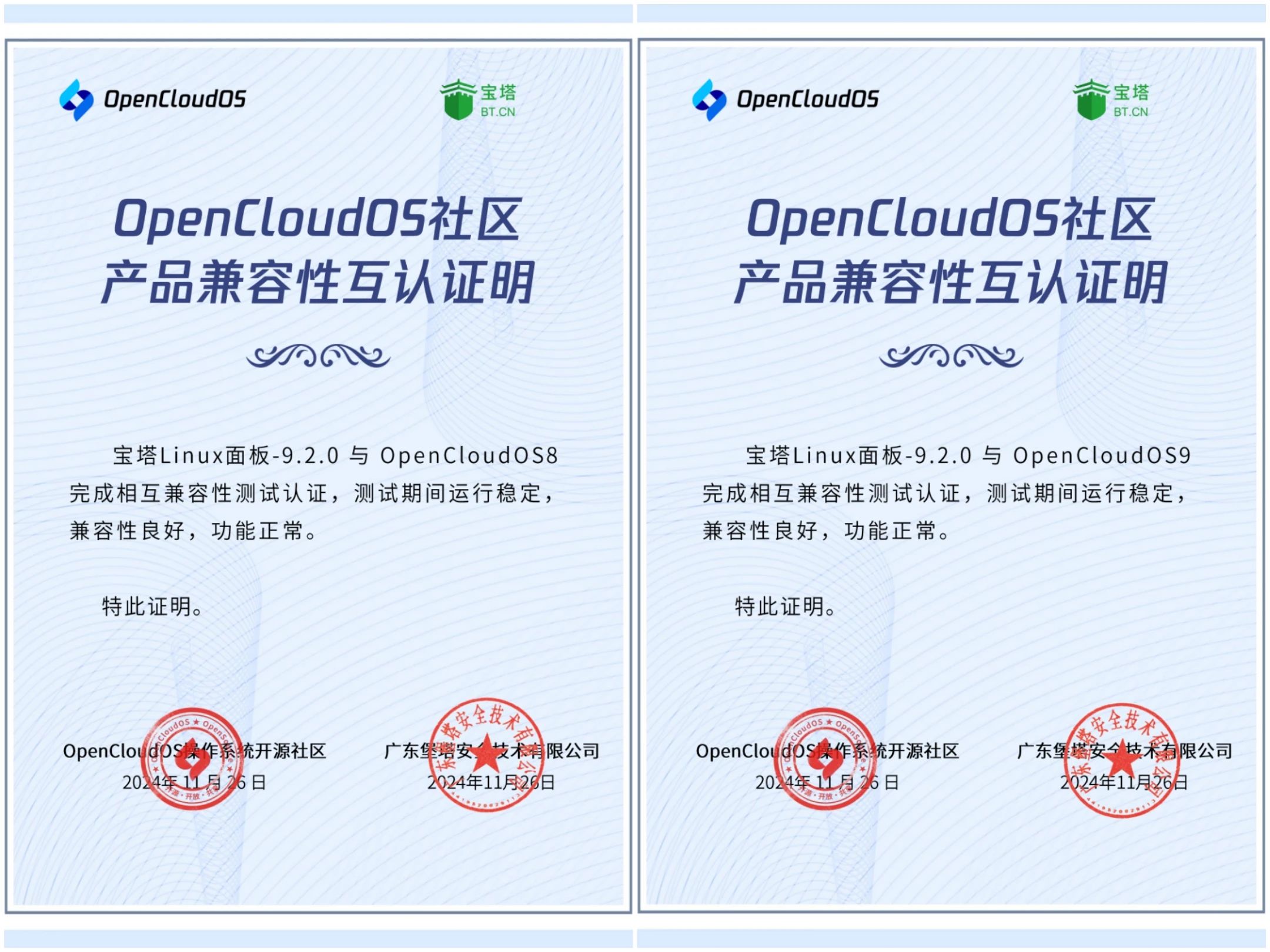 近日,宝塔面板正式加入 OpenCloudOS 操作系统开源社区,并完成了宝塔 Linux 面板与 OpenCloudOS 8/9 的相互兼容认证,测试期间,整体运行稳定,在功能、性能及兼容性方面表现良好。