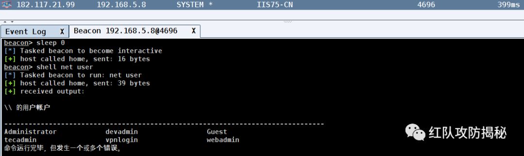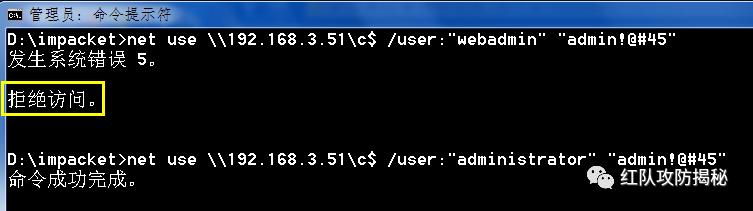 # net use \\192.168.3.51\c$ /user:"webadmin" "admin!@#45" 此处的webadmin用户其实是一个rid非500的目标系统管理员用户# net use \\192.168.3.51\c$ /user:"administrator" "admin!@#45"