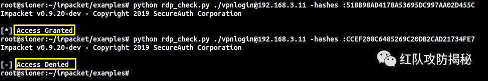 # python rdp_check.py ./vpnlogin@192.168.3.11 -hashes :518B98AD4178A53695DC997AA02D455C# python rdp_check.py ./vpnlogin@192.168.3.11 -hashes :CCEF208C6485269C20DB2CAD21734FE7